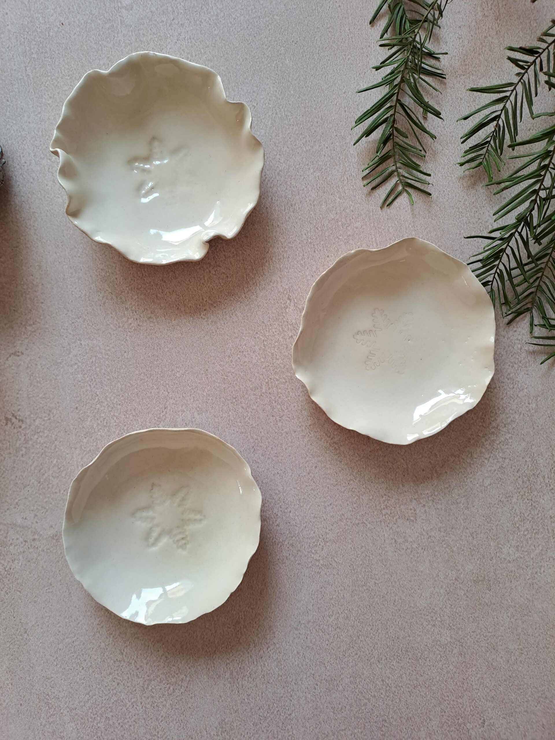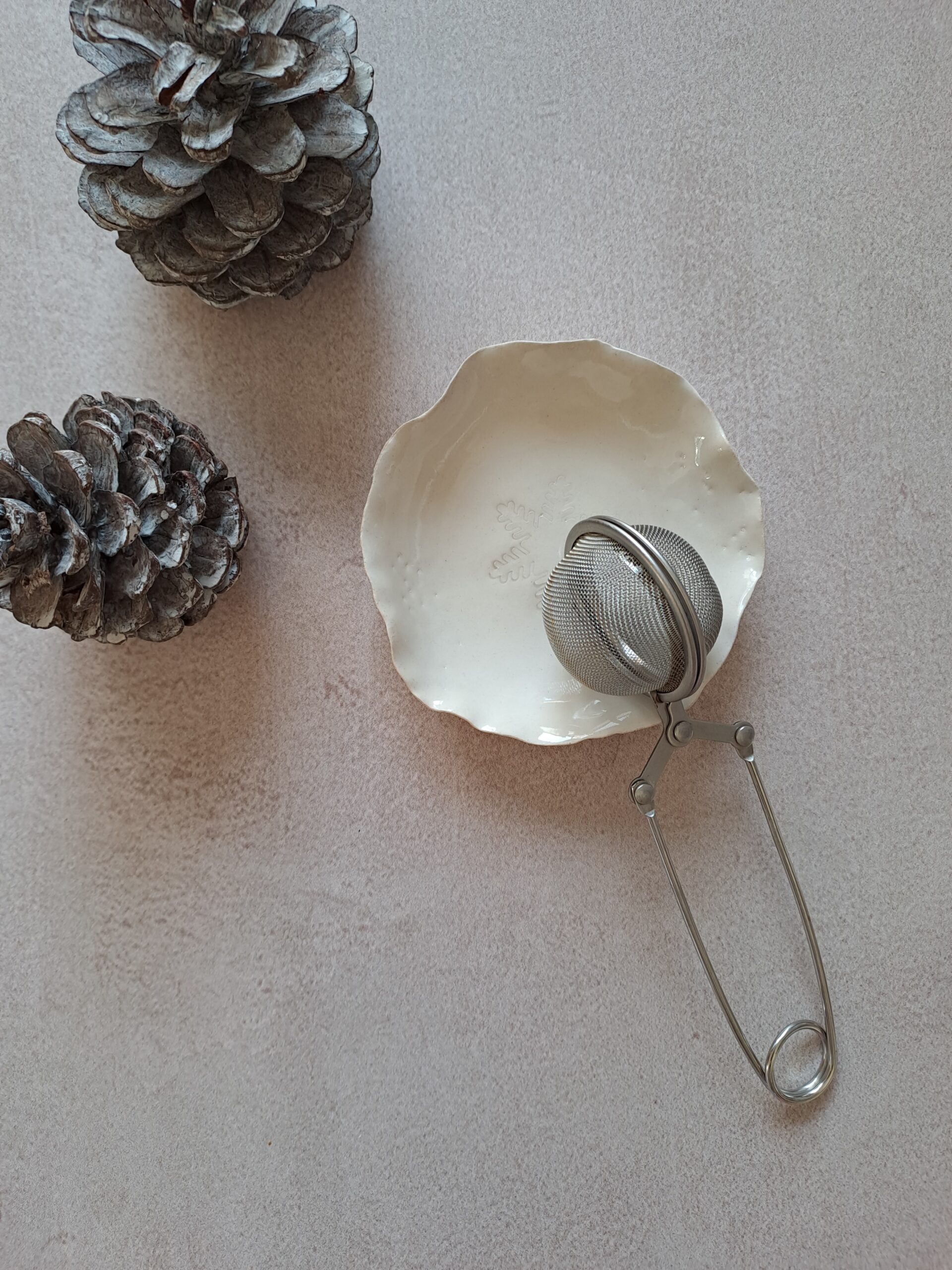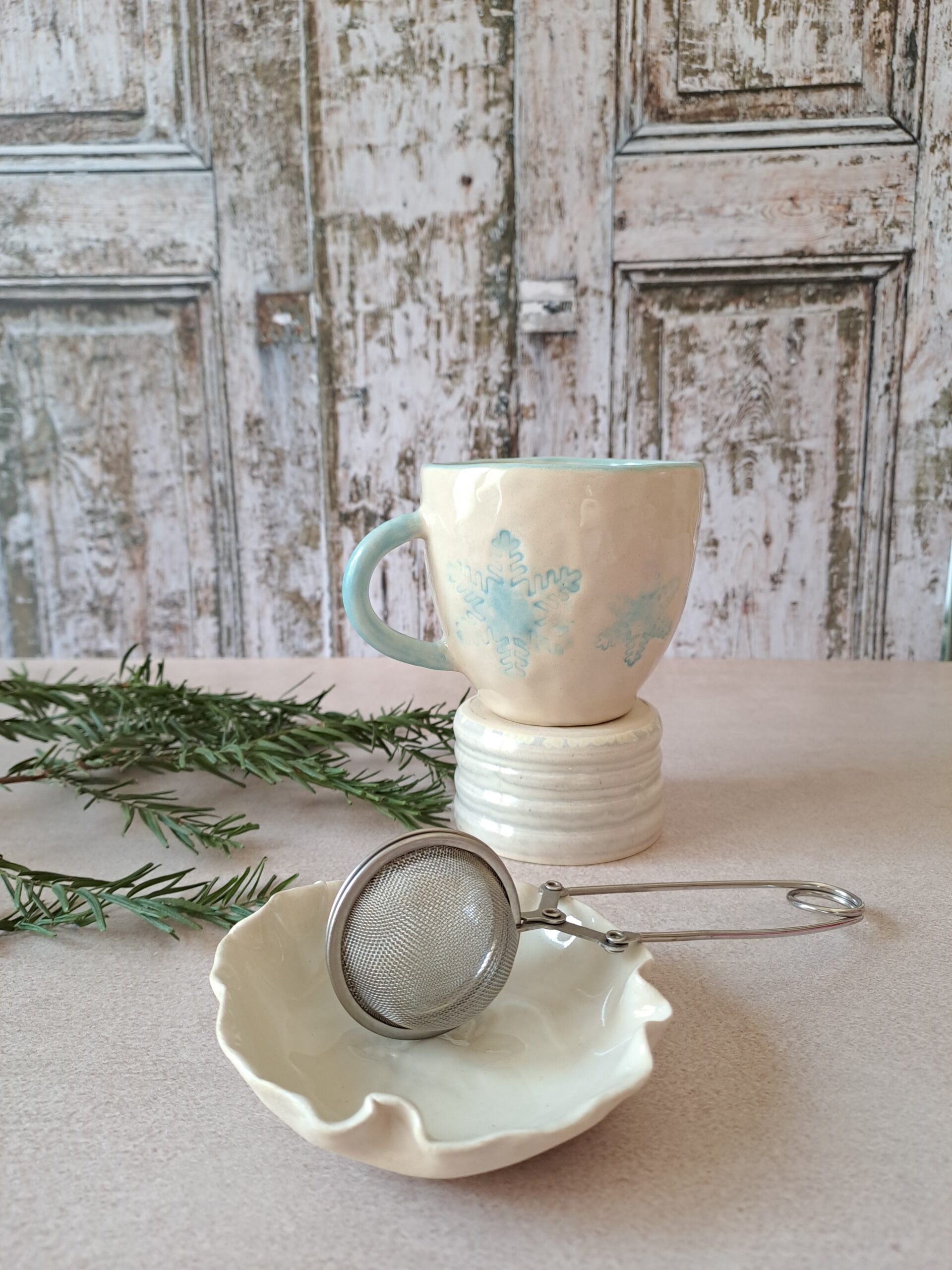 Coupelle repose-sachet de thé « Flocon d’Hiver » – Élégance hivernale en grès fait main