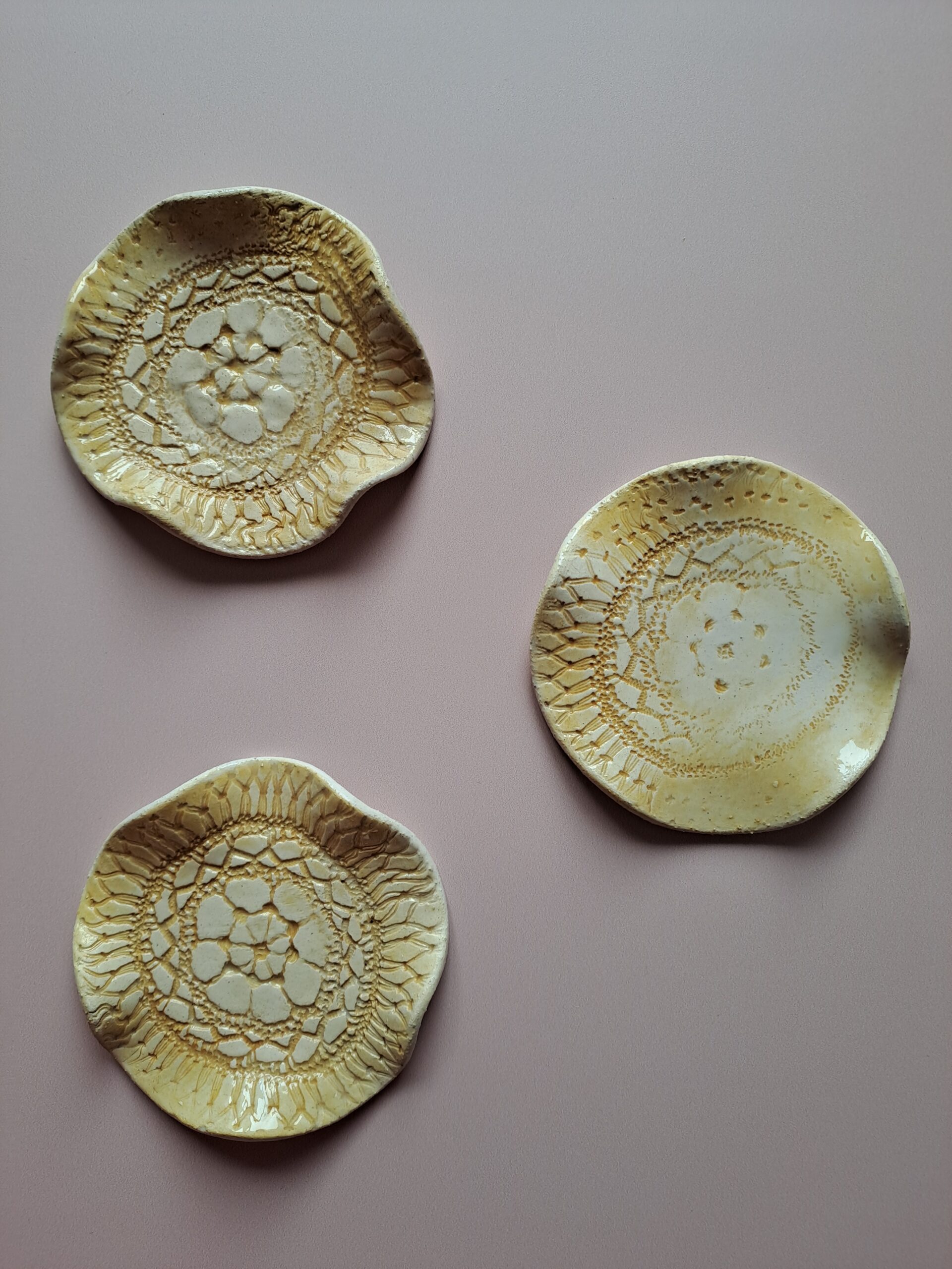 Ses trames délicates sont tracées par de la vraie dentelle, imprimée dans l’argile pour en révéler toute la finesse et la complexité.